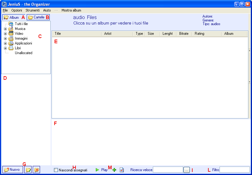 Quello che si inserisce nelle colonne Author e Genre (per i file audio) e Type (per gli altri file) determinerà la collocazione del file nelle sottocategorie Autore, Genere, Film, Music video, TV, Anime, Photo o Icone (a seconda del tipo di file).