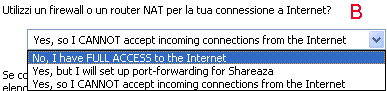 La tua connessione è limitata da un firewall o da una NAT? -No, ho PIENO ACCESSO ad internet -Si, ma aprirò una porta per shareaza -Si, NON POSSO ACCETTARE connessioni in entrata |